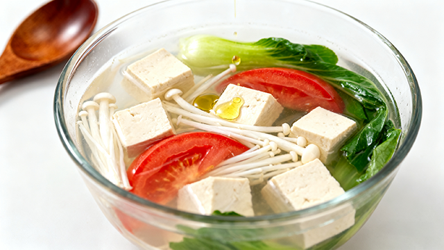 再比如豆腐蔬菜汤,嫩豆腐切小块,加番茄、金针菇、青菜,加水煮 10 分钟,出锅前放一点点盐和香油。